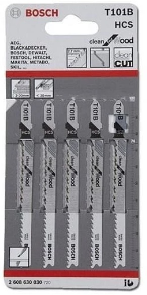 Набор полотен для лобзика Bosch 100×2.7 мм 5шт (2608630030) предназначены для быстрого и качественного выполнения резов таких материалов как мягкая древесина, пластик и т. д. Оснастка обладает качеством, признанным во всем мире. Пилки изготовлены из высококачественной быстрорежущей стали HSS. Длина каждой пилки составляет 100 мм, шаг зуба — 2,7 мм. Оснащены стандартным EU хвостовиком Т-образной формы, что позволяет использовать их с большинством моделей электролобзиков.