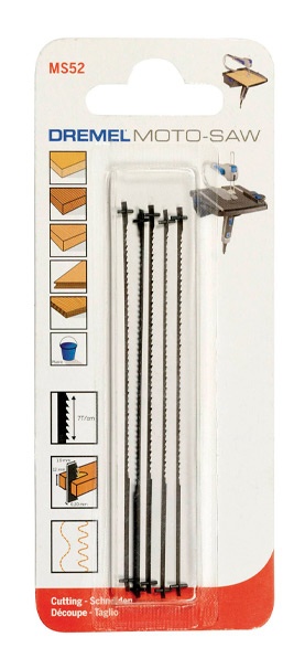 Пильное полотно по дереву DREMEL MS52 (2615MS52JA) - предназначено для лобзикового станка Dremel Moto-Saw. Применяется для работ по металлу, твердой и мягкой древесине, фанере, пластику и ДСП. Длина — 100 мм. Ширина полотна — 0.2 мм.Количество — 5 шт.