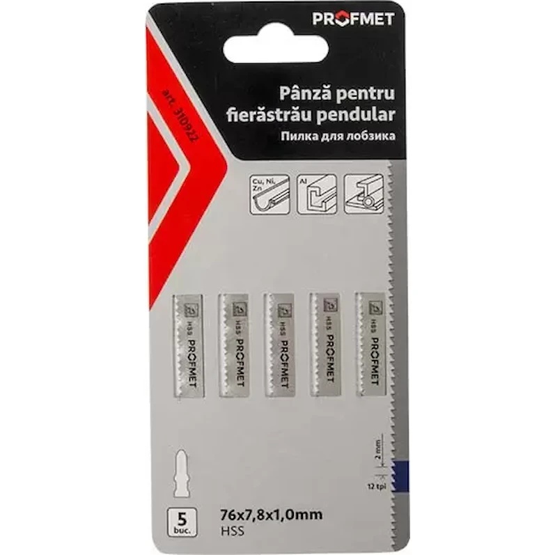 Полотно для лобзика по металлу с общей длиной 76,5 мм, рабочей длиной 55 мм, толщиной 1 мм и шагом зубьев 12 TPI (зубьев на дюйм), выполнено из быстрорежущей стали (HSS). Это полотно оптимизировано для резки тонких до средней толщины металлических листов, труб и профилей, включая сталь, алюминий и медь. Высокая стойкость к износу и способность к точной резке делают его идеальным инструментом для проектов, требующих точности и аккуратности.