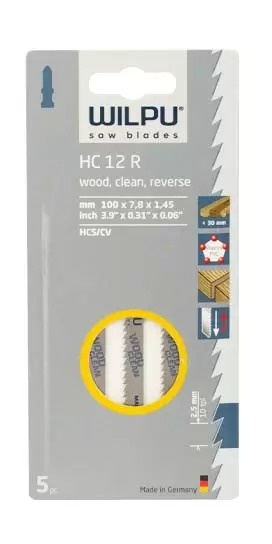 Полотно HC12R от WILPU предназначено для чистой и точной резки всех типов древесины (толщиной до 30 мм) и пластиковых материалов. Лезвие изготовлено из преобразованной стали, имеет коническую форму для повышенной точности и чистоты реза без сколов. Зубья заточены под углом и поперечно шлифованы, что обеспечивает ровную и аккуратную резку.