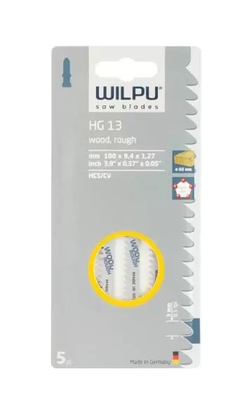 Полотно HG13 от WILPU, изготовленное из высоколегированной инструментальной стали (HCS/CV), идеально подходит для быстрой и эффективной резки древесины мягких пород и пластиков. Оптимизированный дизайн зубьев делает его подходящим для различных задач по обработке дерева.