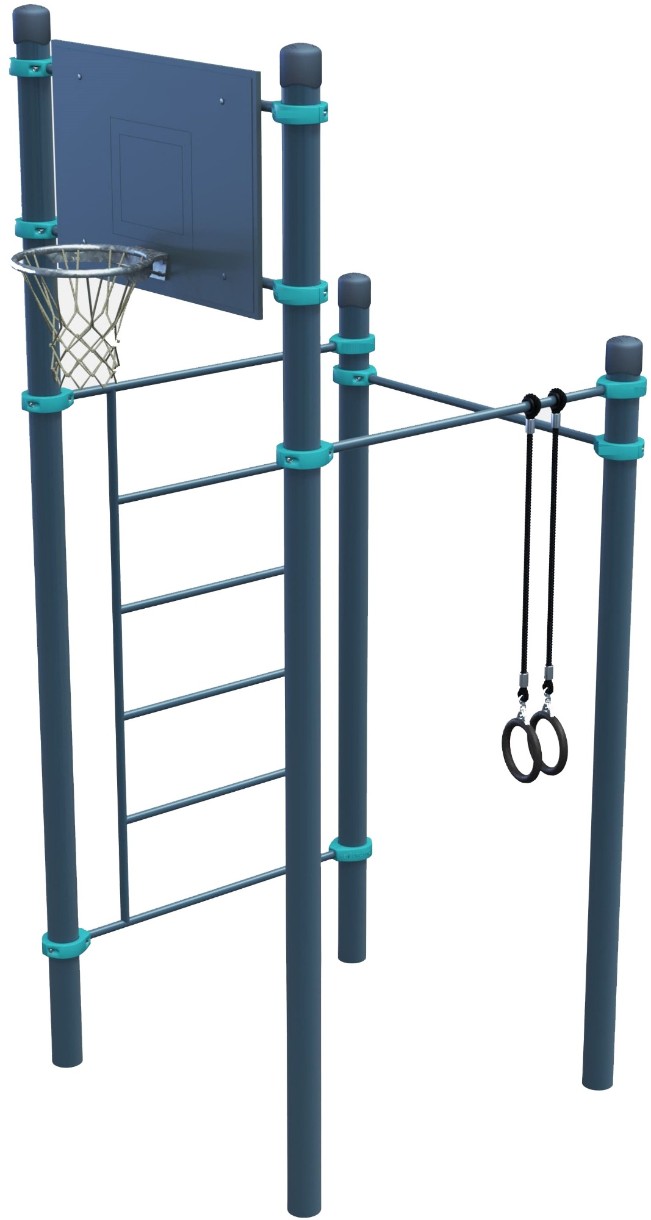 Комплектация: 2 разноуровневых турника, кольца, баскетбольный щит с кольцом, шведская стенка.