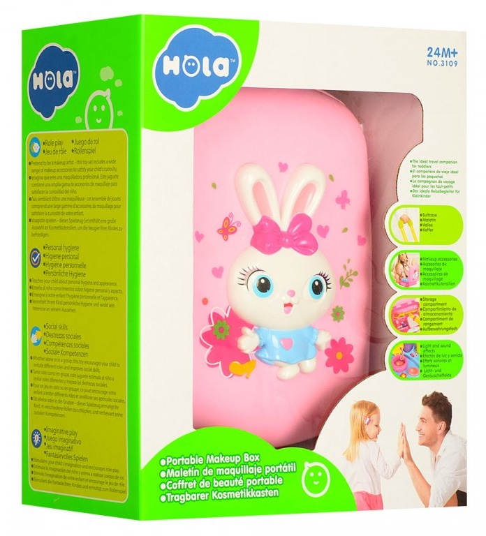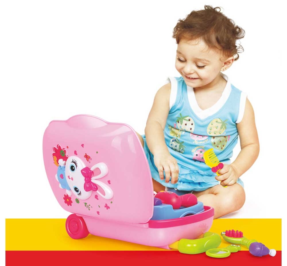 С этим чемоданчиком у маленькой леди будет под рукой все, что может понадобиться для макияжа. В комплекте: игрушечные расчески, зеркальце, фен, помада, духи. Чемоданчик с выдвижной ручкой и колесиками легко перемещать и удобно хранить. Игрушка со звуковыми эффектами и мелодиями. Работает от 3 батарей AА (не в комплекте). Для детей от 2 лет.