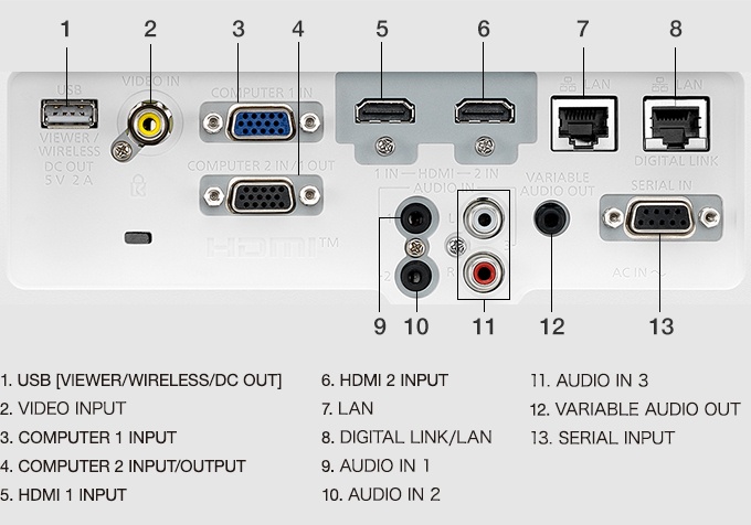 — Высокое время службы проектора — 20 000 часов. В проекторе используется лазерно-гибридный источник света, что позволяет заметно увеличить срок службы эксплуатации по сравнению со сроками службы ламп традиционных проекторов.
