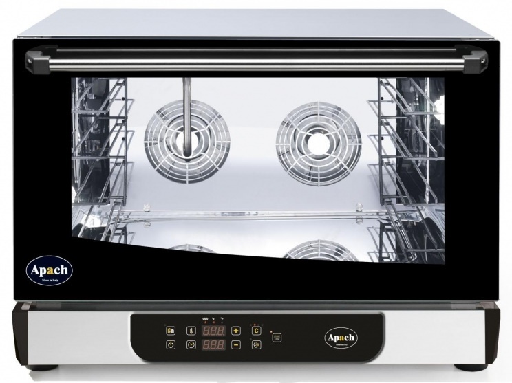 Конвекционная печь Apach AD46D предназначена для выпекания или разогрева кондитерских и хлебобулочных изделий, готовых блюд, замороженных или предварительно выдержанных в расстоечном шкафу заготовок из теста на предприятиях общественного питания и торговли. Подсветка камеры осуществляется галогеновой лампой. Камера легко чистится благодаря закругленным углам. Корпус выполнен из нержавеющей стали, дверца — из двойного закаленного стекла.