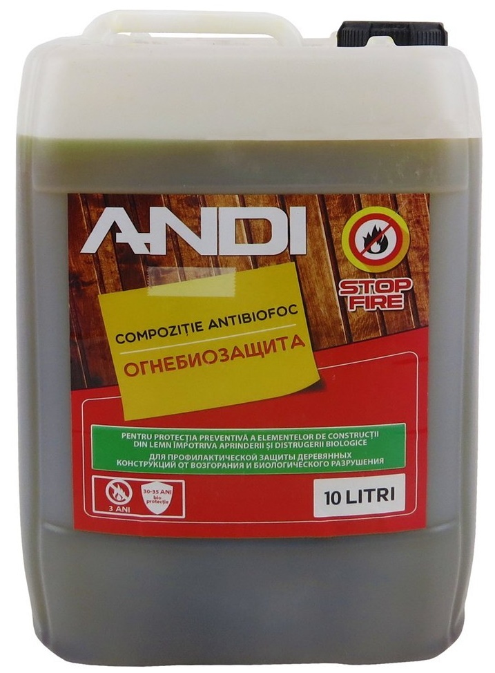 Огнебиозащитный состав ANDI — это универсальное средство, обеспечивающее дополнительную защиту деревянных конструкций от возгорания и биологического разрушения (гниения, насекомых-древоточцев, гриб- ков, плесени, синевы и пр.).