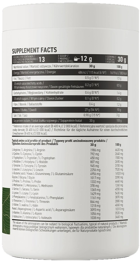 OstroVit Soy Protein Isolate — это высокоэффективная пищевая добавка в виде порошка на основе изолята соевого белка, содержащего до 90% чистого белка. Этот веганский продукт идеально подходит для спортсменов и тех, кому требуется повышенное количество белка в рационе.