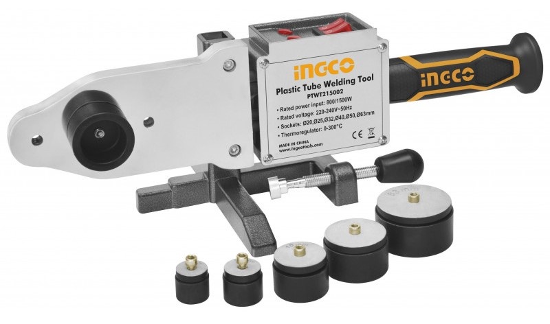 Паяльник пластиковых труб INGCO PTWT215002 предназначен для сварки фитингов и различных по диаметру пластиковых труб. Время нагрева до рабочей температуры - 3 минуты. У паяльника плавная регулировка температуры нагрева, максимальная температура нагрева 300°C. Мощность нагревательных элементов составляет 1500 Вт. В удобном металлическом кейсе вложены 6 тефлоновых насадок различных диаметров: 20, 25, 32, 40, 50, 63 мм,шестигранный ключ, отвертка, ножницы для резки труб, подставка для паяльника.