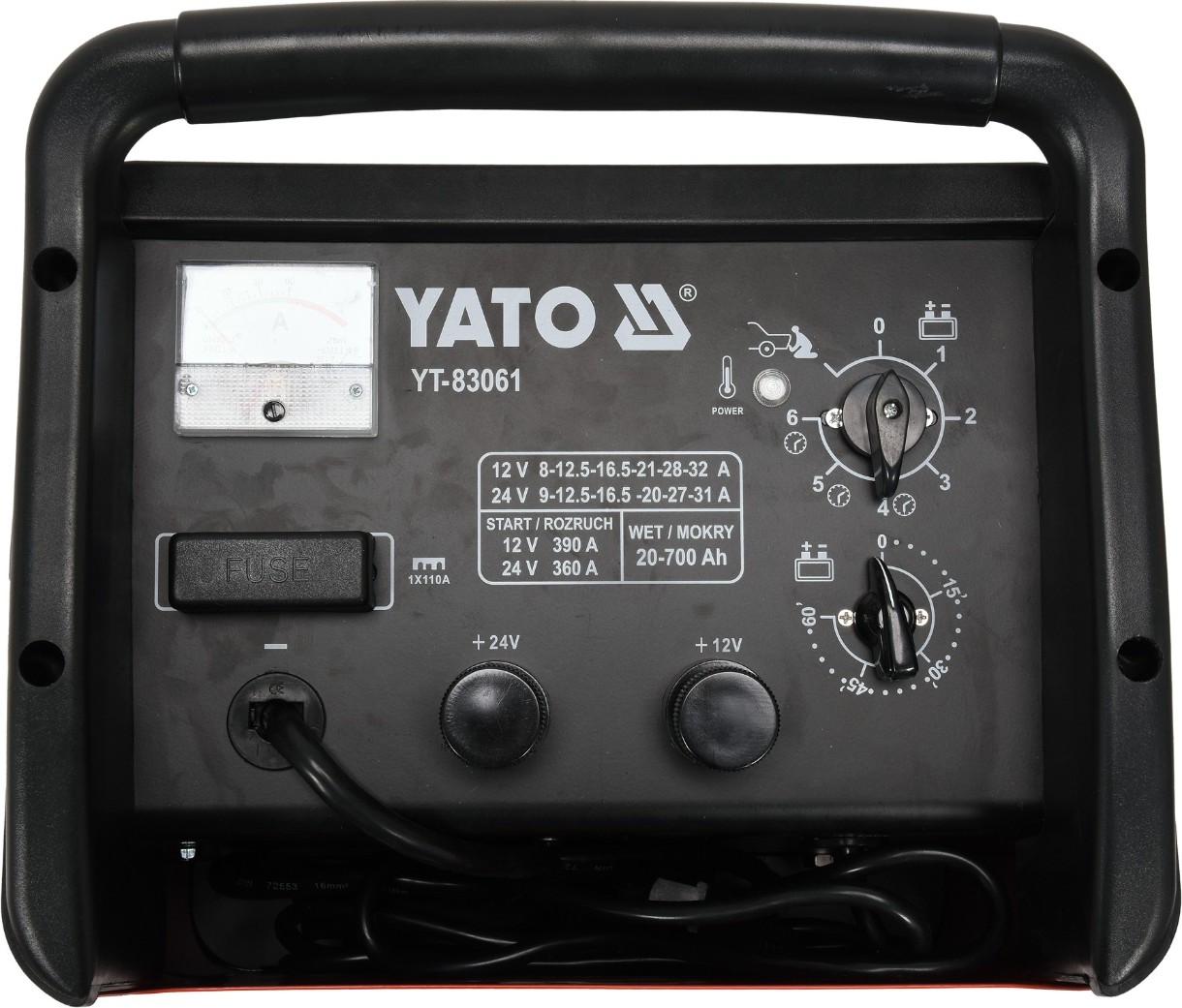 Выпрямитель YATO YT-83061 с функцией помощи при запуске. Поддерживает аккумуляторы емкостью от 20 Ач до 100 Ач. Максимальный пусковой ток для аккумуляторов 12 В составляет 390 А, для аккумуляторов 24 В — 360 А.
