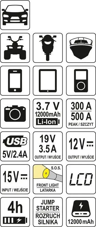Пусковое зарядное устройство YATO YT-83082 это переносной аккумулятор высокой производительности, который способен запустить двигатель автомобиля в случае разряда основного аккумулятора. Также он может заряжать технику и гаджеты. Такая богатая многофункциональность делает этот аккумулятор с емкостью 12000 мАч отличным помощником в повседневной жизни собственного автомобиля при севшем аккумуляторе или в морозы без посторонней помощи.
