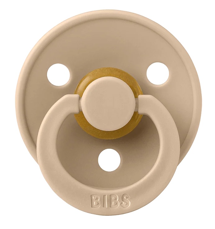 Пустышки BIBS из коллекции Color имеют круглую внешнюю форму с 3 отверстиями, которые обеспечивают циркуляцию воздуха и предотвращают раздражение вокруг рта ребенка. Кольцо вокруг пустышки круглое с гравировкой BIBS.