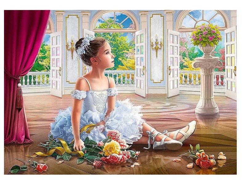 Пазлы на 500 элементов с великолепным жизнерадостным изображением маленькой балерины с букетом цветов, которая элегантно сидит на полу в просторной танцевальной зале. В сложенном виде размер картинки составляет 48х34 см. Высокое качество, насыщенность цветов и безопасность при сборке пазлов обеспечивает специальный каландрированный картон, который отражает свет и покрыт экологическими красками.