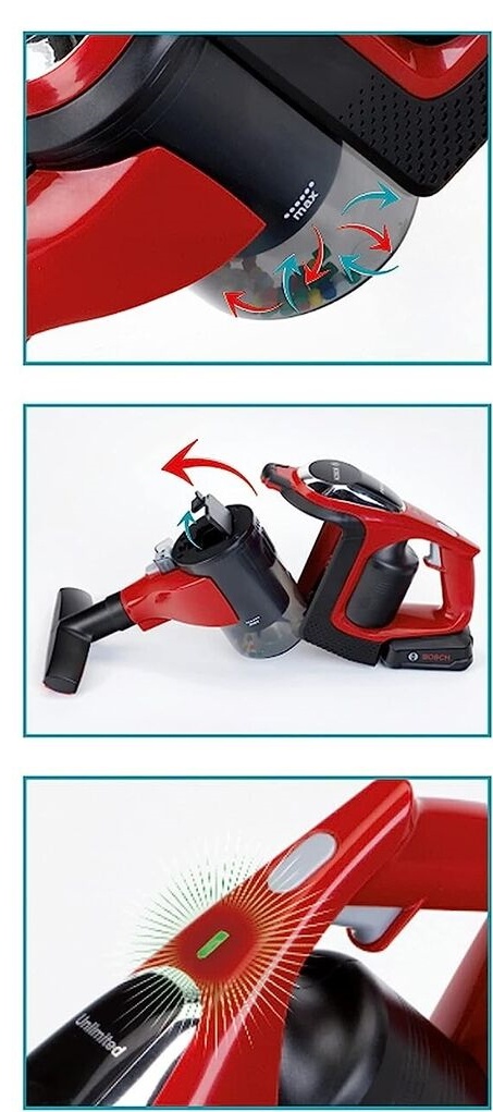 Игрушечный пылесос Klein Bosch Unlimited - точная копия современных аккумуляторных пылесосов, которые выпускает немецкая компания Bosch. Стильный дизайн, реалистичный шум во время работы и всасывания цветных шариков, делают его продуманным и интересным для ребенка.