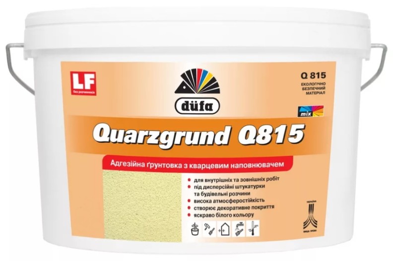 Для внутренних и наружных работ. Содержит чистый кварц. Применяется в качестве адгезионного покрытия перед последующим нанесением акриловых дисперсионных штукатурок иструктурныхкрасок, для подготовки защитно-армирующих слоев систем утепления, зимней консервации фасадов. Может использоваться в качестве самостоятельного декоративного покрытия. Предназначена для грунтования цементных и цементно-известковых штукатурок, кирпича, бетона, защищенных металлических элементов, крепких окрашенных поверхностей, а также гипсовых штукатурок и шпатлевок, ДВП, ДСП, QSB и OSB, гипсокартона, фанеры внутри помещений.