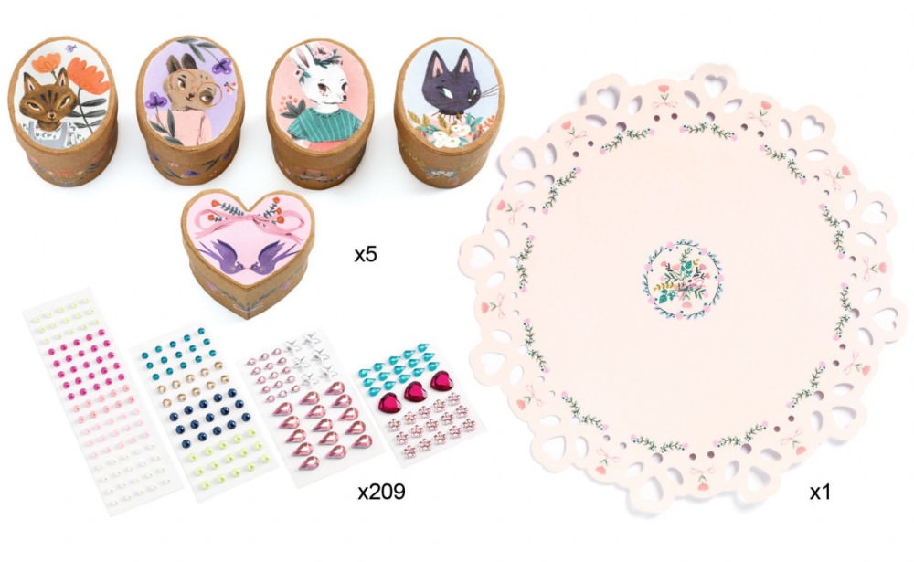 Комплектация5 мини-коробочек (размеры: 5 х 4 х 3,5 см), 4 листа с мини-наклейками, "драгоценные камни", декоративная подставка, буклет с пошаговой инструкцией