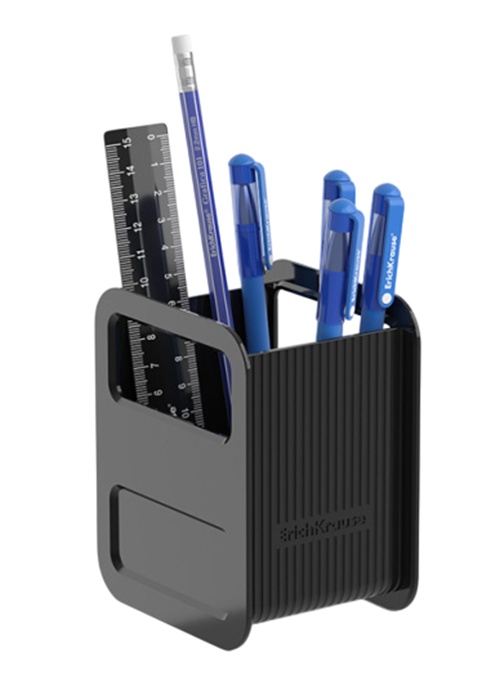 Комплект с наполнением и подставкой из высококачественного пластика строгого дизайна. Включает 6 предметов: 4 ручки, карандаш и линейку.