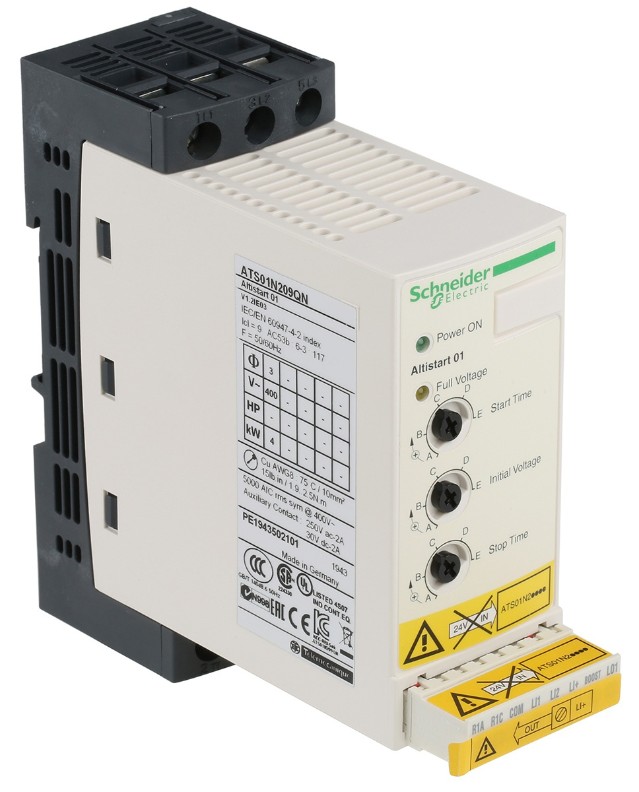 Регулятор оборотов Schneider Electric ATS01N209QN — это компактное и надежное устройство плавного пуска для трехфазных асинхронных электродвигателей. Обеспечивает мягкий старт и остановку за счет постепенного увеличения и снижения напряжения, что защищает двигатель от резких нагрузок, снижает износ и повышает срок службы оборудования. Отличается тихой и стабильной работой, легкой настройкой параметров и простым монтажом на шинy, что делает его удобным для установки в шкафы управления и автоматические системы. Подходит для промышленного и бытового применения в механизмах, где требуется контролируемый запуск, безопасность и энергоэффективность.