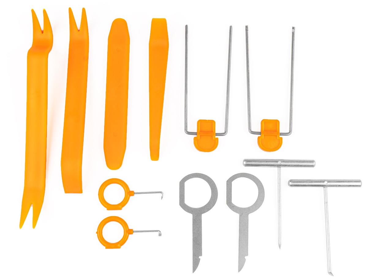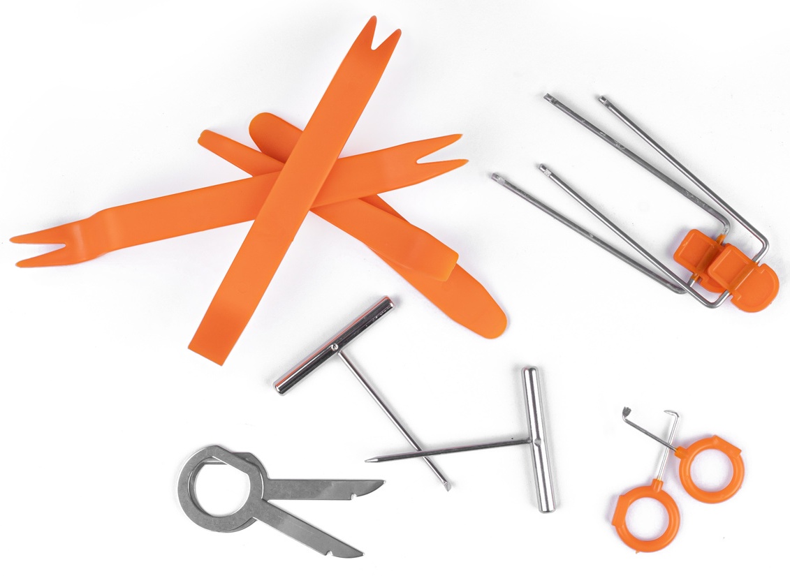 Предлагаемый набор состоит из 12 различных открывалок, которые вы будете использовать при снятии обивки, кузова, радиоприемников, навигатора, уплотнителей, дверных крышек или панели приборов вашего автомобиля.