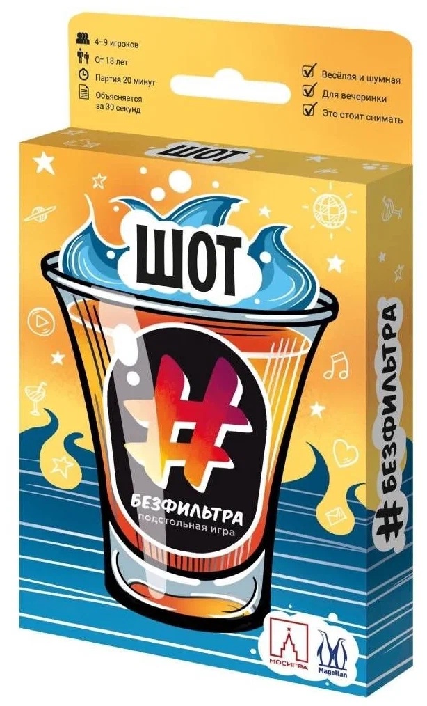 "Шот #безфильтра" – весёлая игра для разгорячённой компании. Вы либо выполняете задание, либо пьёте. Задания – про близость (вплоть до поцелуев), про откровенные разговоры и поступки. А ещё про соцсети – вот подписчики удивятся! С каждым заданием и с каждым глотком игра всё веселее и откровеннее.
