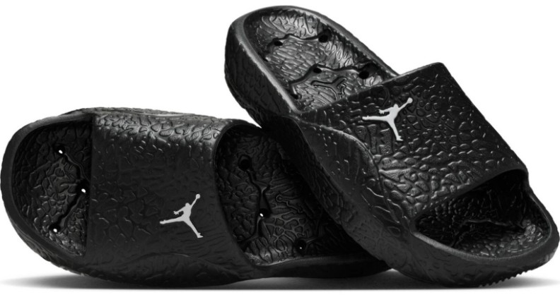 Изогнутая анатомическая стелька мягко поддерживает стопу, создавая ощущение стабильности. Рельефный принт Elephant на стельке улучшает сцепление и добавляет характерный акцент в стиле Jordan. Дренажные отверстия по всей подошве способствуют быстрому отводу воды, а рисунок протектора «ёлочка» усиливает сцепление на влажных поверхностях. Брендинг Jumpman завершает дизайн узнаваемым фирменным штрихом.