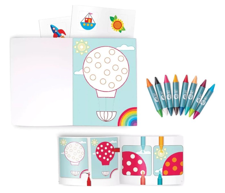 Обучающий набор для рисования, идеально подходящий для самых маленьких детей и для их первого опыта работы с мелками. Ребенок шаг за шагом учится выражать себя с помощью цветных карандашей, изображая красивые узоры из повседневной жизни. Учит цвета, так как в набор входит 8 двойных восковых мелков 16 разных цветов, и экспериментирует с ними, раскрашивая распечатанные изображения.