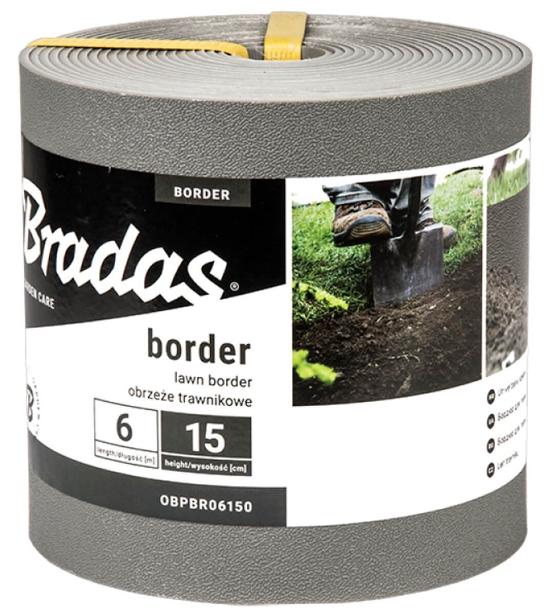 Массивный и очень крепкий бордюр препятствует прорастанию травы, используется для отделения газона от участков клумб и сада. Бордюрная лента имеет фактуру апельсиновой шкурки.