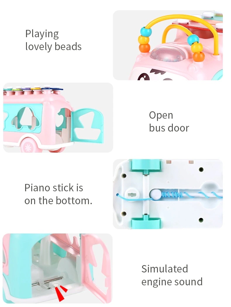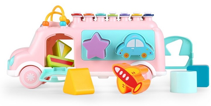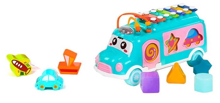 Автобус - сортер сделан из качественных и безвредных для самых маленьких карапузов материалов. Автобус имеет привлекательную расцветку и много интересных деталей. Сверху у этого чудесного автобуса находится музыкальный инструмент детский ксилофон, который состоит из семи пластиночек разной тональности. Стучать по ним надо будет специальной палочкой, которая крепится за шнурок к игрушке. Таким образом, она не потеряется, а ещё, держась за неё, удобно будет возить за собой этот автобус, который к тому же является каталкой. Ну и третья функция игрушечки – сортер. Здесь есть семь разных отверстий, по которым надо будет рассортировать нужные фигурки. Малыш сможет изучать во время игры форму и цвет, также у него будет развиваться логика, внимание, мелкая моторика.