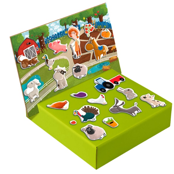 Развивающая игра «Магнитная ферма» от компании Dodo – это увлекательный набор, созданный для любознательных детей, которые хотят узнать больше о жизни на ферме. Игра состоит из 44 магнитов, включая животных, их любимую еду, трактор и фермер. Все элементы можно размещать на специальном планшете с ярким пейзажем, который входит в комплект. Магниты также можно прикреплять на любые металлические поверхности, такие как холодильник или двери.