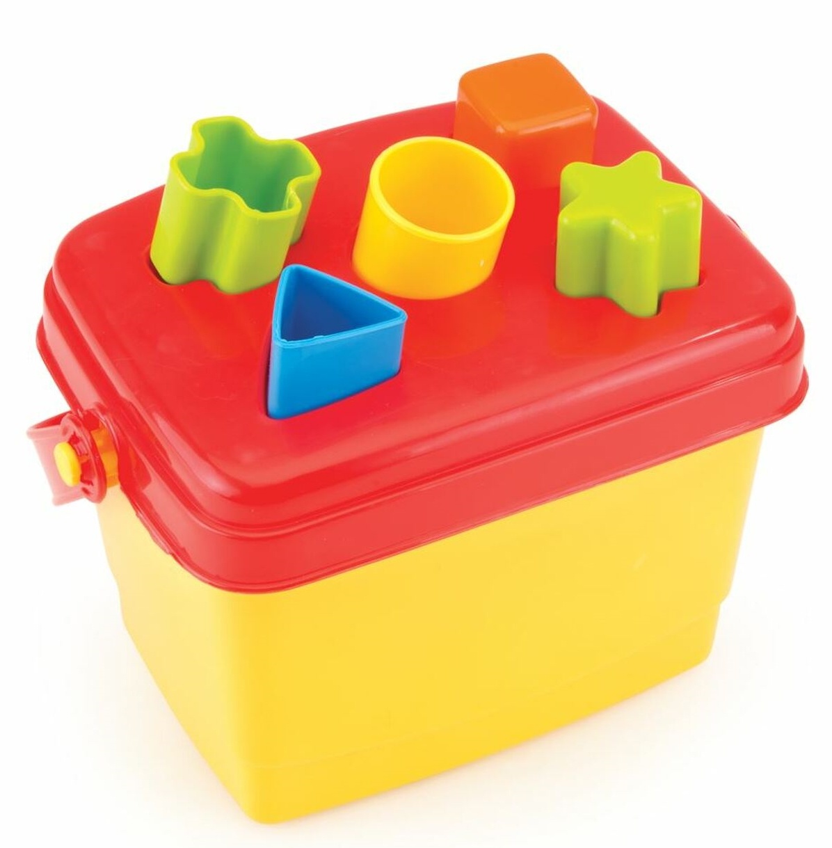 Яркий контейнер с удобной ручкой разнообразит игры детей, а также поможет им развить фантазию, мелкую моторику и цветовосприятие. На крышке изделия предусмотрены отверстия разной формы, в которые крохи должны вставить соответствующую формочку из комплекта, тренируя таким образом логическое мышление.