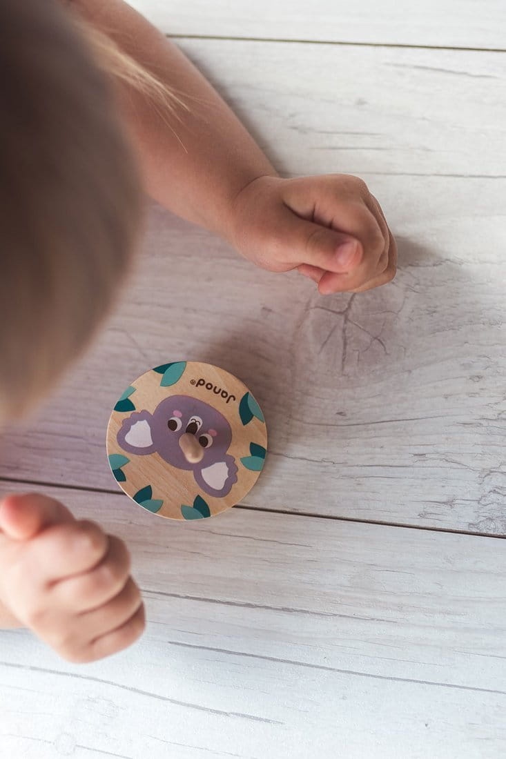 Карманный волчок от Janod. Маленькая деревянная юла с различными милыми рисунками животных.