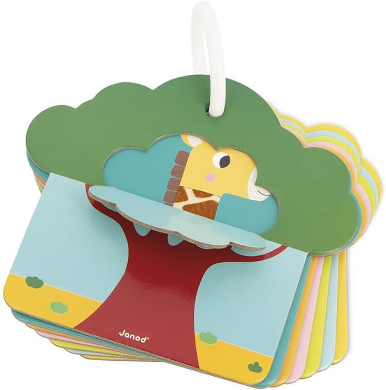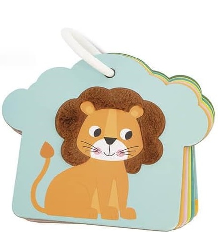 Игрушка для раннего обучения, которая занимает мало места и ее можно легко носить с собой повсюду благодаря пластиковому кольцу, соединяющему карточки друг с другом.