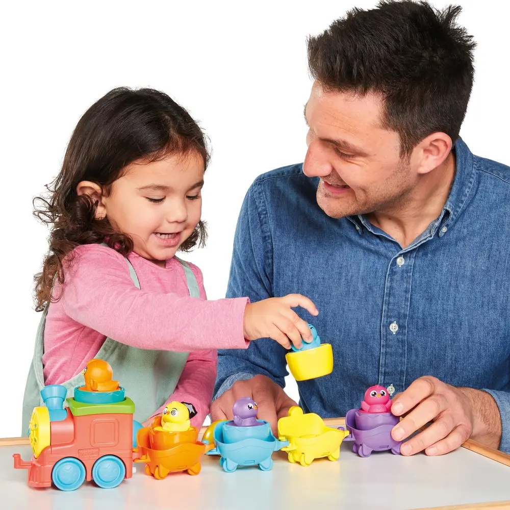 Нажимайте и слушайте - Многоцелевая сенсорная игрушка заставляет ваших малышей насторожиться, когда каждый разноцветный цыпленок щебечет, когда вы сжимаете. Поместите цыплят в их каюты и соедините все каюты вместе, чтобы сформировать игрушечный поезд.