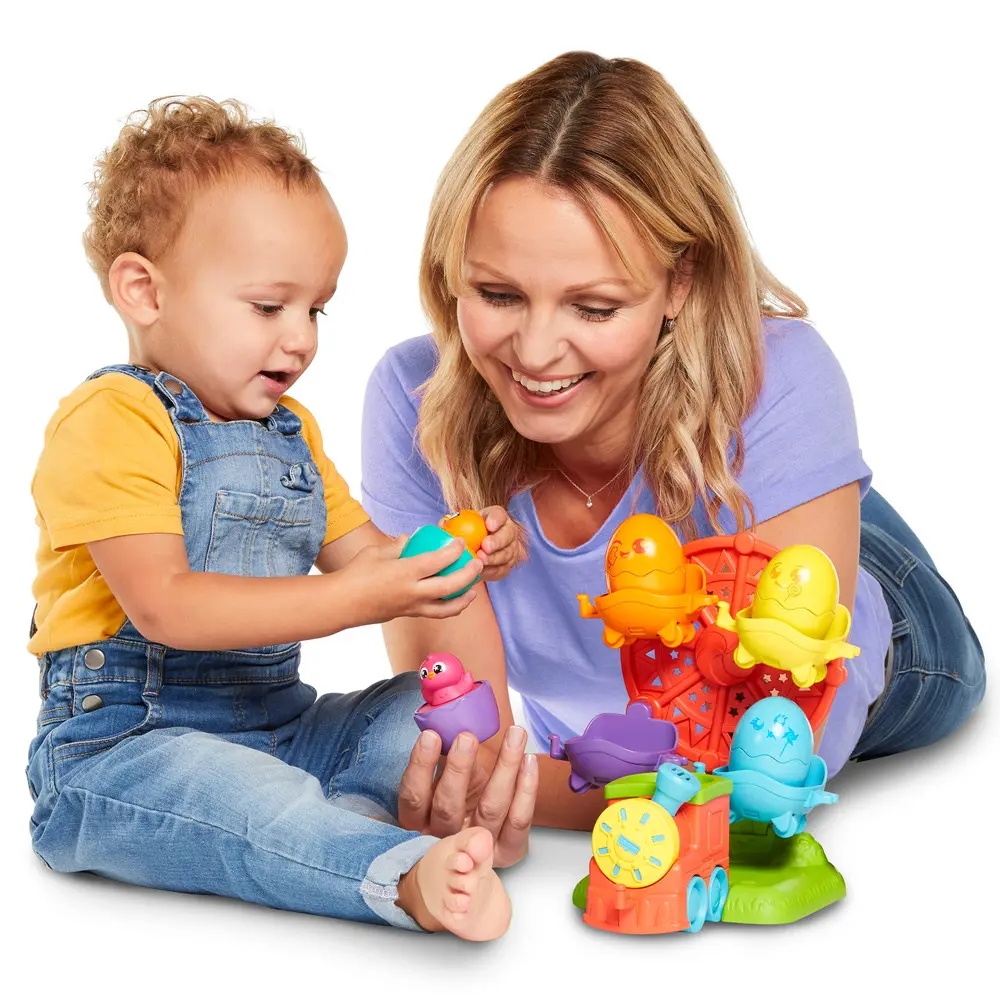 Отличное пасхальное развлечение: этот поезд 2-в-1 оснащен вращающимся колесом обозрения с кабинами, которые можно трансформировать в толкающий поезд с тележкой. Присоедините тяговый двигатель и прижмите цыпленка водителя вниз, чтобы крутить колесо!