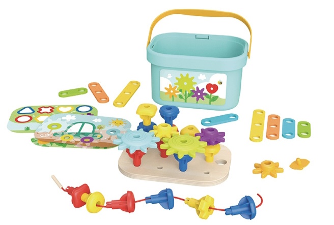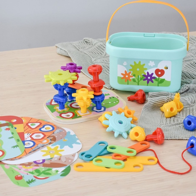 Игровой набор от Tooky Toy со сложной концепцией, но простым дизайном, поможет Вашим детям развить инженерные навыки. Положите одну из 10 двухсторонних карточек на деревянную игровую основу, поместите шестерни в отверстия, соотнося цвета, а теперь попробуйте их покрутить. Также малыш может складывать, нанизывать, подбирать, сортировать и строить с набором радужных колышков.