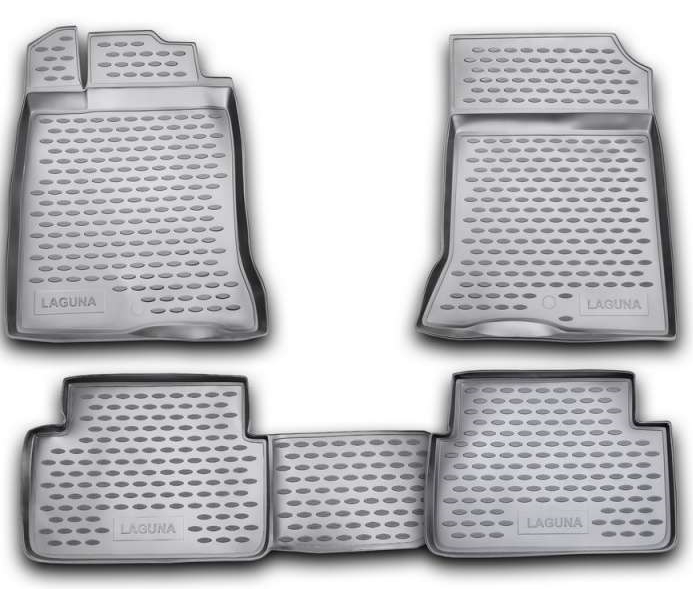 Коврики в салон для RENAULT Laguna III 2007-2015 изготовлены из экологически чистого полимерного материала. Представленные коврики пластичны, не боятся химически активных веществ. Одним из плюсов является фиксация ковриков специальными крепежами. Производитель гарантирует, что во время движения автомобиля коврики не сдвинутся с места. Конструкция ковриков исключает блокирование педали тормоза, акселератора или сцепления. Нужно отметить, что передние коврики имеют специальный язычок, который закрывает площадку отдыха левой ноги, а задние коврики соединены между собой перемычкой.