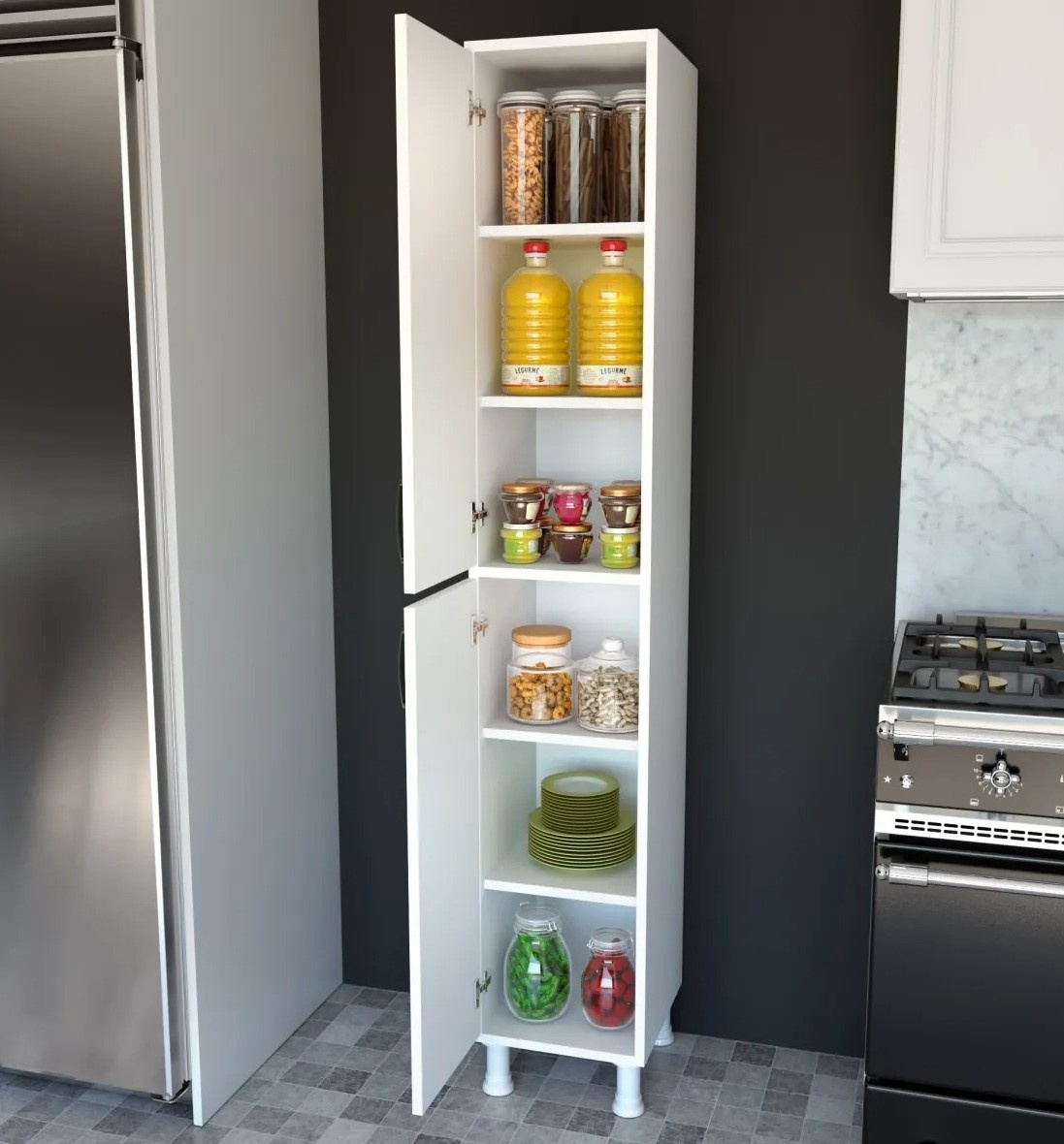 Размеры тумбы — ширина 33,3 см, высота 191 см и глубина 35,8 см — разрабатывались так, чтобы максимально эффективно использовать доступное место. Компактность позволяет разместить её в любой комнате: спальне, гостиной или рабочем кабинете. Конструкция также может быть закреплена на стене для повышенной устойчивости и безопасности.