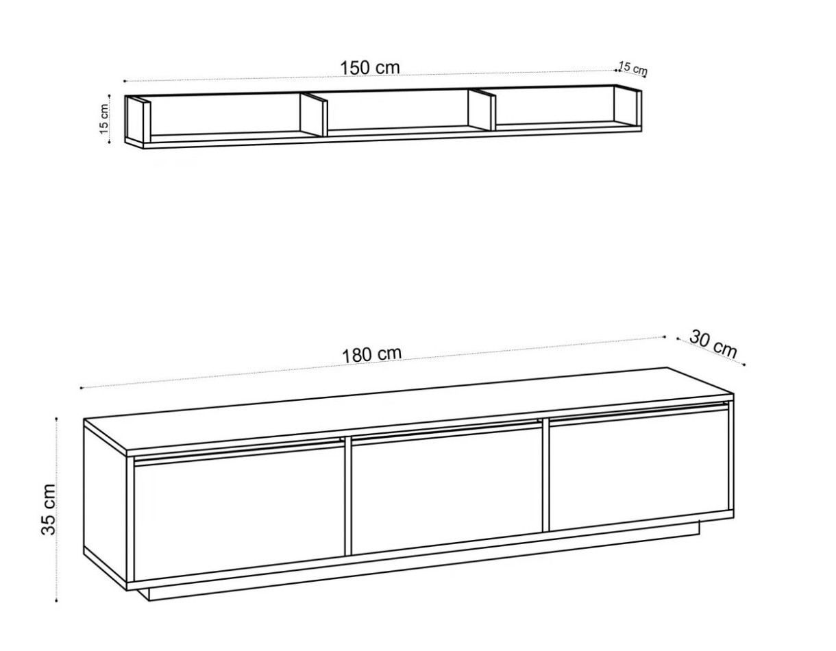 Благодаря нескольким полкам тумба под ТВ предлагает достаточно места для аксессуаров и техники. Здесь удобно разместить DVD-диски, игровые консоли, книги и декоративные элементы. Габариты тумбы под ТВ — ширина 180 см, высота 35 см и глубина 30 см — позволяют удобно разместить телевизор и другие медиустройства.