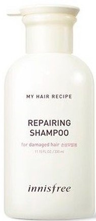 Innisfree My Hair Recipe Repairing Shampoo восстанавливающий шампунь для поврежденных волос со специально подобранным комплексом из натуральных масел арганы, макадамии и жожоба, JEJU SOYBEAN COMPLEX из концентрата и масла соевых бобов и ферментированным маслом камелии.