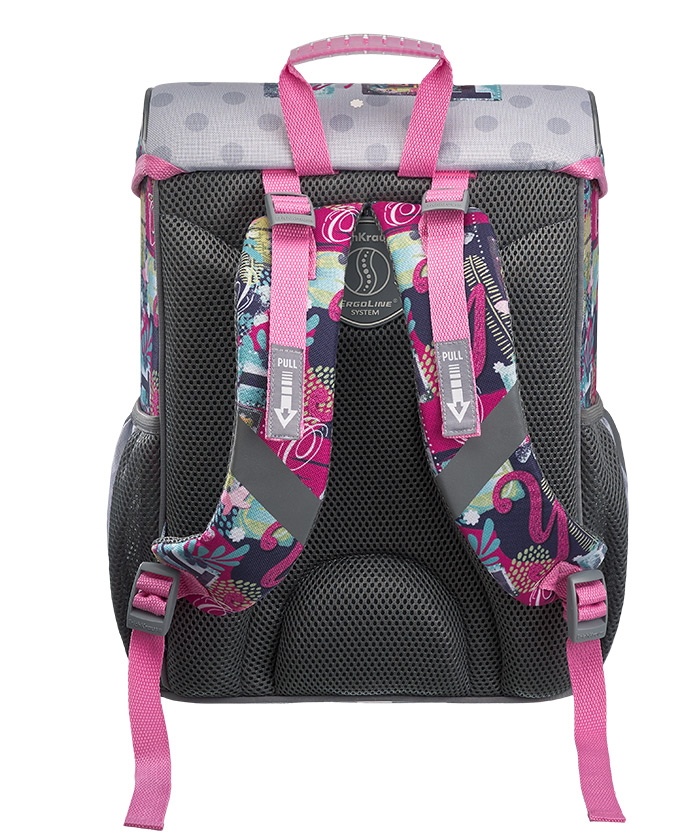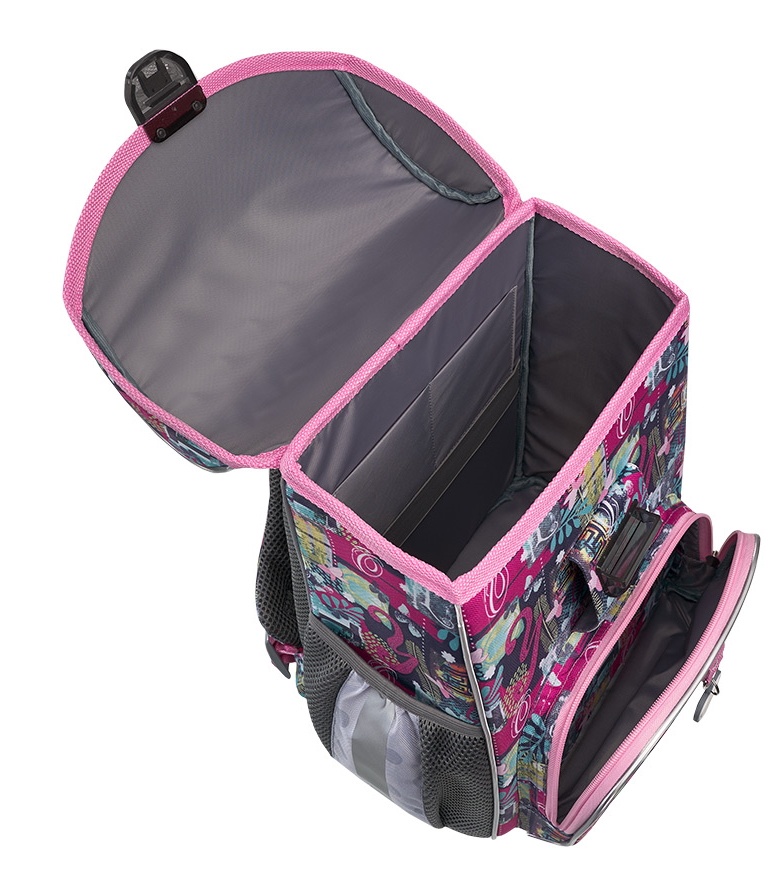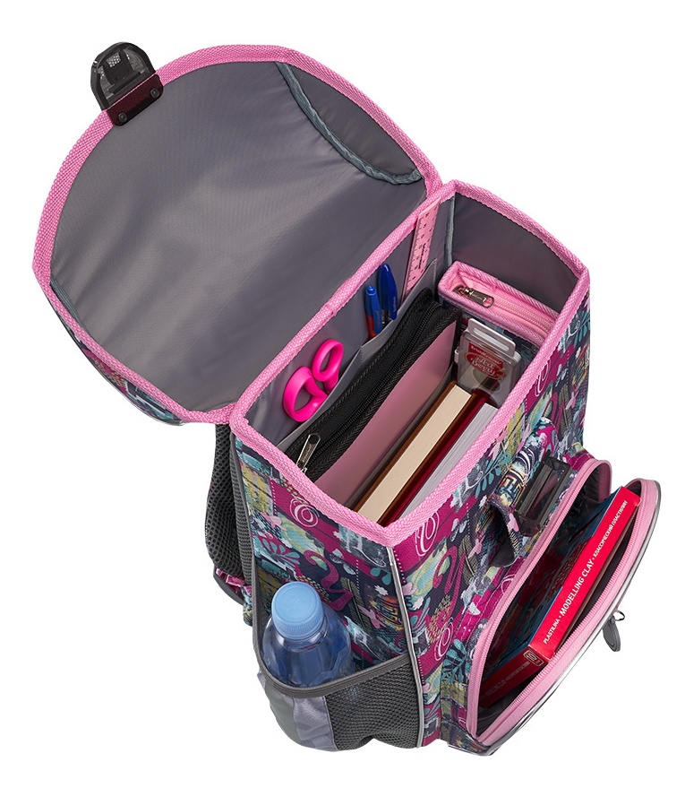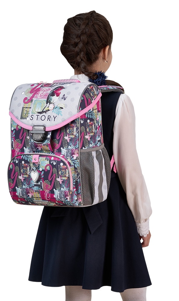 Жёстко-каркасный ранец с эргономичной спинкой. Объём: 15 литров. Вес: 680 грамм* — один из самых лёгких в категории. *Без дополнительной фурнитуры. Одно вместительное отделение, внутри эластичный фиксатор для тетрадей и учебников формата А4+ и мини-органайзер для канцелярских принадлежностей. Снаружи фронтальный карман на надёжной молнии с мягким ходом и два боковых кармана на резинке для бутылки с водой или зонтика. Эргономичная конструкция спинки ErgoLine®System из мягких подушечек распределяет вес ранца и снижает нагрузку на позвоночник ребёнка. "Дышащая" ткань AirMesh и воздушные каналы между подушечками спинки препятствуют образованию влаги. Мягкие S-образные лямки не давят на плечи. Светоотражающие элементы по всему периметру ранца. Ручка с резиновой накладкой для переноски в руке. Крепления ручки и лямок усилены дополнительными швами из лавсановых нитей. 100% полиэстер Оксфорд с полиуретановой пропиткой устойчив к износу и морозу. Пластиковые ножки защищают от загрязнений и влаги.