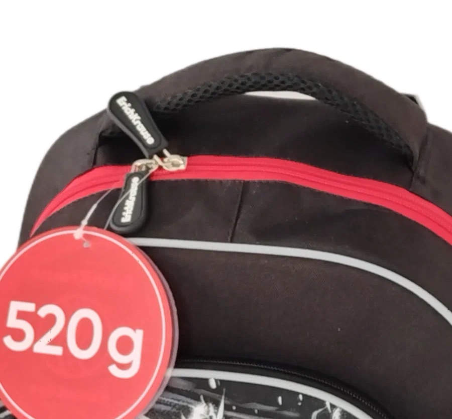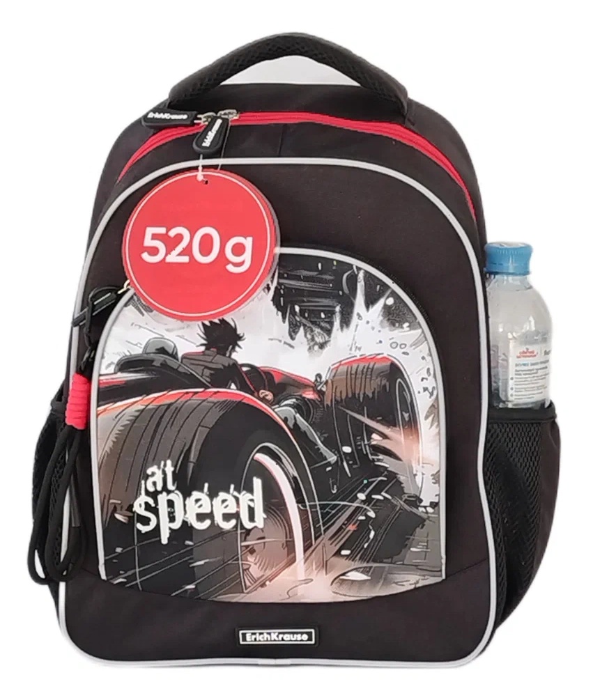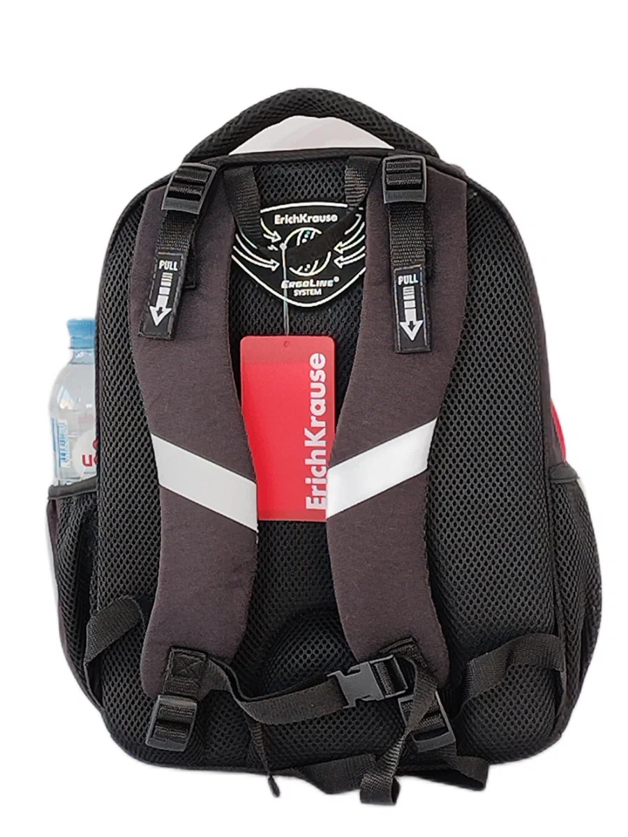 Этот рюкзак размера 39х28х14 см объёмом 15 л изготовлен из полиэстера 600D с полиуретановой пропиткой, что делает его устойчивым к износу и морозу. Внутри вместительное отделение с эластичным фиксатором для тетрадей и учебников формата А4+. Также есть мини-органайзер для мелкой канцелярии и карман на молнии. На дне – жёсткая откидная вставка. Снаружи фронтальный карман на молнии с плавным ходом, а также два боковых на резинке, куда можно положить бутылку с водой или зонтик. Рюкзак весит всего 520 г, что делает его одним из самых лёгких в своей категории. У модели эргономичная спинка ErgoLine® System с грудной перемычкой. Такая конструкция из мягких подушечек равномерно распределяет вес рюкзака и снижает нагрузку на позвоночник. Ткань спинки AirMesh “дышит”, а воздушные каналы между ее подушечками препятствуют образованию влаги. Мягкие S-образные лямки не давят на плечи ребёнка, а грудная перемычка фиксирует положение рюкзака на теле. Светоотражающие элементы по всему периметру повышают безопасность в темноте. Модель также оснащена объёмной и удобной ручкой для переноски в руке. Крепления ручки и лямок усилены дополнительными швами из лавсановых нитей. Пластиковые ножки защищают от загрязнений и влаги. Рюкзак ErichKrause ErgoLine® – оптимальный выбор для занятий в школе.