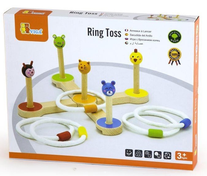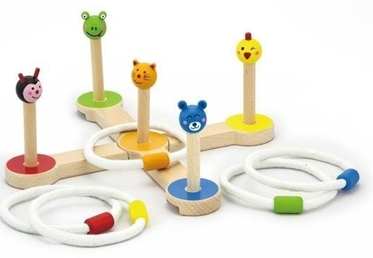 Набор включает 2 деревянных планки основы, 5 колышков с забавными животными и 5 разноцветных колец.
