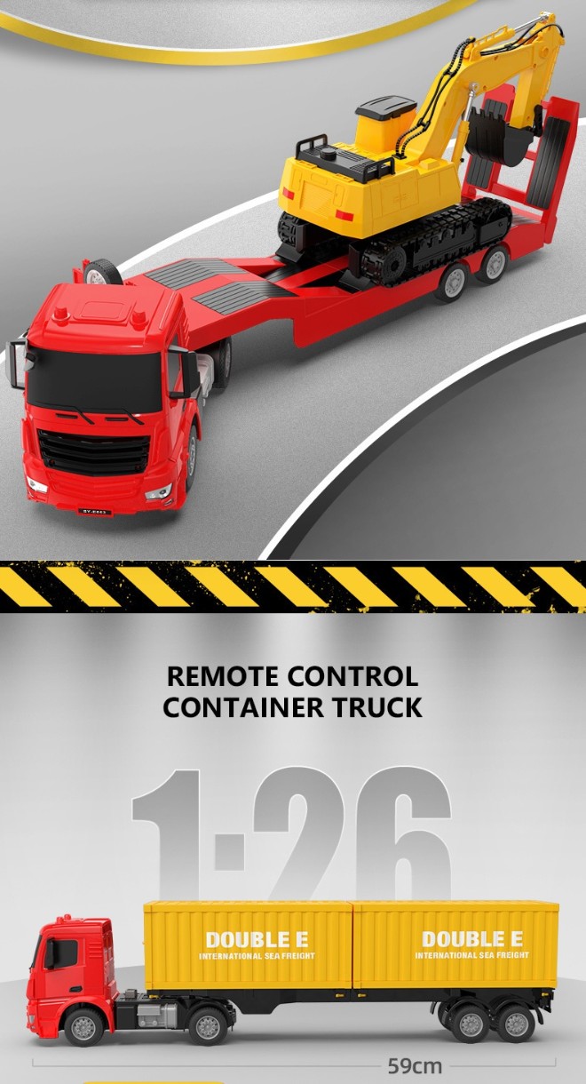 Радиоуправляемый трайлер Double E Mercedes-Benz Arocs с экскаватором масштаб 1:26 2.4G - E663-003 - это радиоуправляемый грузовик Mercedes-Benz с экскаватором в комплекте. Грузовой прицеп можно пристегивать и отстегивать, он предназначен перевозить грузы. Звуковое сопровождение запуска автомобиля, движения, заднего хода и остановки тягача.