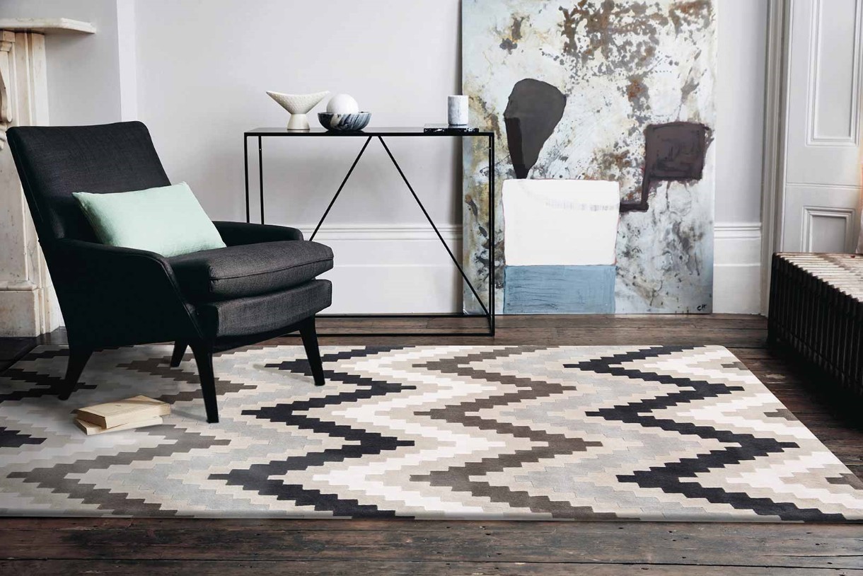 Ковер Scala имеет крупномасштабный современный шевронный дизайн с богатым, глубоким ворсом и мягкой шерстяной текстурой.