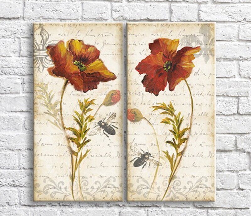 Картина Magic Color Dark/Orange poppies and bees on the background of the text, vintage, diptych (3467634)