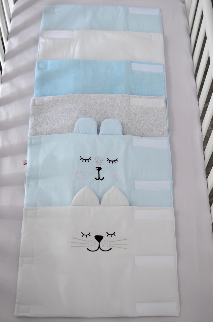 Новинка от Бэби Верес – комплект мягких фенс-бамперов из 6 единиц. Каждая единица рассчитана для крепления на 2 рельса детской кроватки (14-18 см) и крепится липучками. Прекрасно защищают малыша от случайных ударов о жесткие элементы детской кроватки и одновременно оставляют возможность созерцания малыша не закрывая полностью обзор.