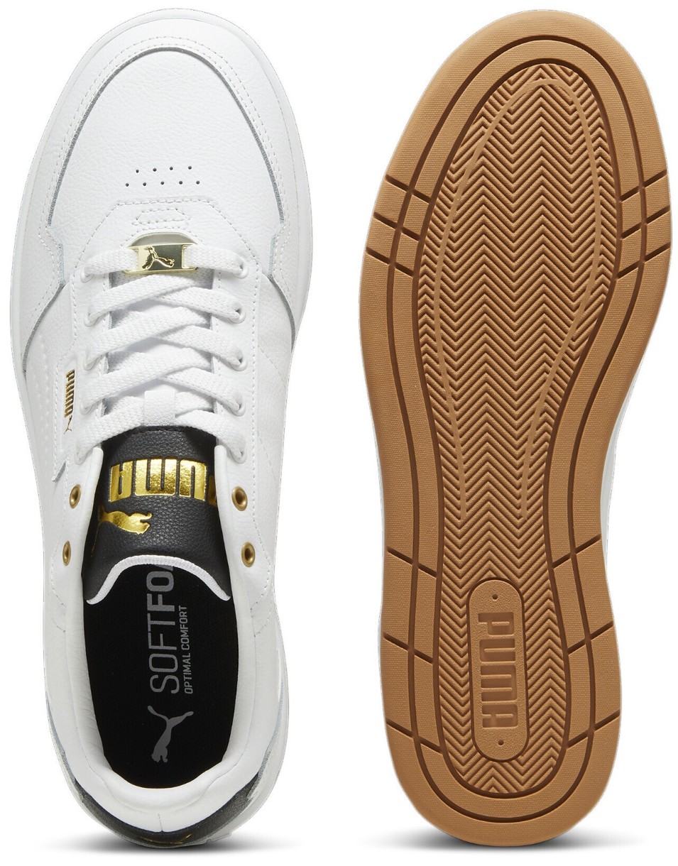 Детали в виде тиснёных золотистых логотипов PUMA и фирменных полос Formstrip придают модели изысканный спортивный стиль. Верх выполнен как минимум на 20% из переработанных материалов, что делает эти кеды экологичным выбором.