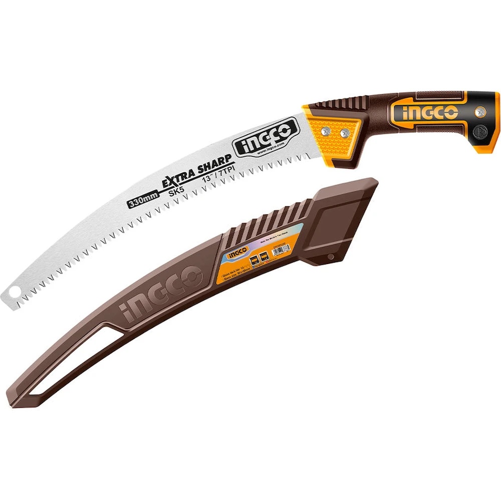 Ручная садовая пила INGCO HPS3306 с изогнутым лезвием длиной 330 мм предназначена для быстрой и точной резки веток, кустарников и небольших деревьев. Пильное полотно изготовлено из прочной углеродистой стали SK5, а зубья с 7 TPI (зубьев на дюйм) прошли термическую обработку и имеют трехгранную заточку для эффективной работы. Инструмент обеспечивает быструю резку и отличается долгим сроком службы, снижая прилагаемые усилия. Удобная двухкомпонентная рукоятка с защитным выступом предотвращает скольжение и защищает руки во время использования. В комплект входит защитный пластиковый чехол для безопасного хранения и переноски, а также предусмотрена функция крепления удлинительной штанги для работы с высокими ветками.