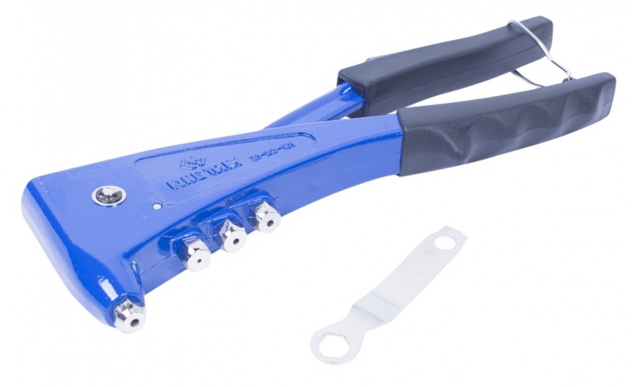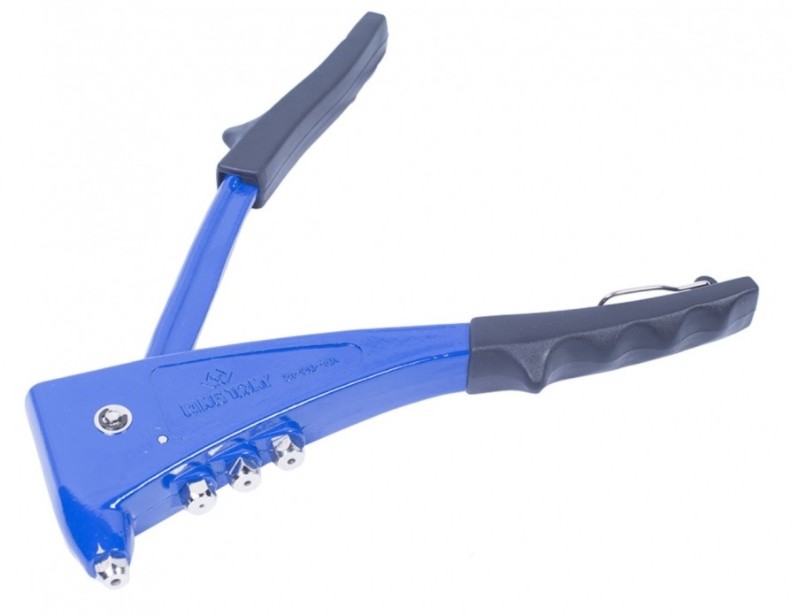 Заклёпочник оснащён зажимными губками из твёрдосплавной стали, адаптерами для заклёпок разного диаметра и специальным ключом.