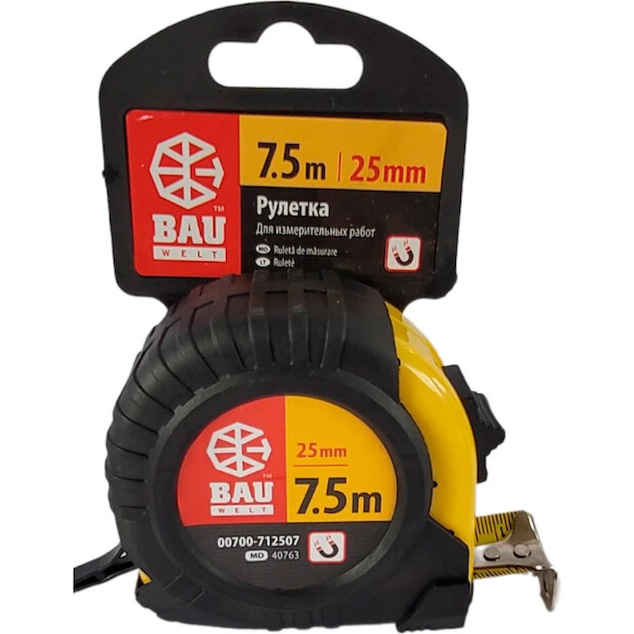 Рулетка BAUWELT 00700-712507 презназначена для измерительных работ. Имеет крепкий матовый пластиковый корпус для удобства пользования. Благодаря магниту на ленте удобно работать с металлическими поверхностями. Преимущества: суперкомпактный ударопрочный корпус; удобный фиксатор ленты; резиновое противоскользяшее покрытие; матовое антибразивное покрытие ленты; прочный нейлоновый ремешок.