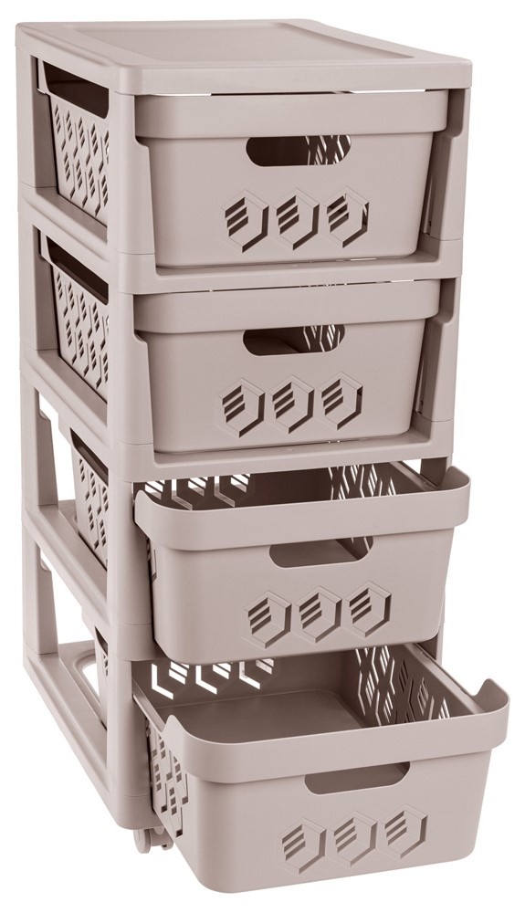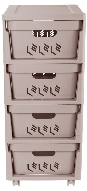 Комод на колёсах Deluxe решит проблему организации вещей в гостиной, ванной, детской, гардеробе и даже на кухне. • Ширина 30 см идеальна для узких пространств • Имеет 4 вместительных съёмных ящика по 12 литров • Сзади имеется ограничитель для фиксации ящиков • Удобные ручки • Колёса вращаются на 360 градусов — лёгкий комод удобно возить • Перфорированные ящики обеспечивают доступ воздуха к содержимому ящиков • Верхняя плоскость может использоваться как полочка • Прост в уходе — достаточно протереть влажной тканью • Поставляется в индивидуальной коробке в разобранном виде; инструкция в комплекте. Легко собирается